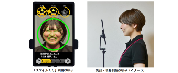 2023年に一部店舗で実験的に導入し、「笑顔・発声の基準」として、口角の角度や声の大きさ、言葉の抑揚、滑舌などの基準を設定。その上で、出勤したタイミングで1日30秒、スマイルくんによるトレーニングを実施した。