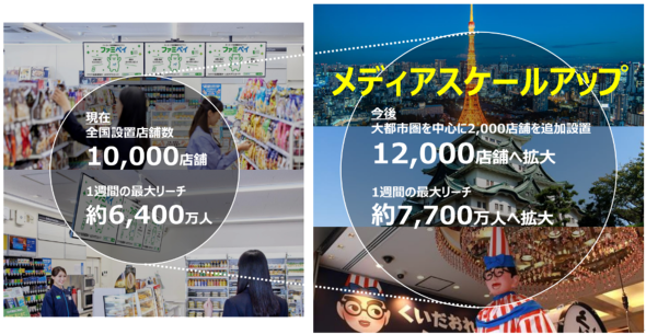 現在、設置数は1万店舗を突破しており、1週間の最大リーチ数は6400万人ほど。今後も大都市圏を中心に設置数を1万2000店舗に拡大し、1週間の最大リーチ数は7700万人を目指すという。