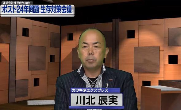 左から、LOGISTICS TODAY代表取締役・編集長の赤澤裕介氏、サンウェイ/エコランド代表取締役社長の高島民仁氏、カワキタエクスプレス代表取締役社長の川北辰実氏。LOGISTICS TODAY主催セミナー「運送会社社長のためのポスト24年問題生存対策会議」のスタジオで、実際のTikTok動画を見る様子なぜ、カワキタエクスプレスは新卒・未経験層の採用に力を入れるようになったのか。その理由は、社内の業務改革と風土変革を進めるためだったと川北社長は話す。