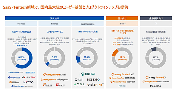 マネーフォワードの事業ポートフォリオを見ると、PFMサービスを含むHome事業の売上高は全体の約13%にとどまる。さらに、前年比16%増という成長率は、会社の基幹事業であるバックオフィス向けSaaSの45%増に比べると見劣りする。つまり、ユーザー数では圧倒的な存在感を示すPFMサービスだが、収益面では期待通りの成果を上げられていない現状が浮き彫りになっている。