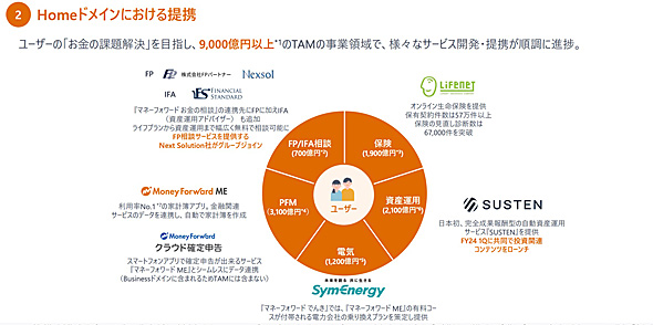 この課題に対し、マネーフォワードはさまざまな施策を講じてきた。プレミアム会員向けの有料サービスの提供、金融商品の比較・紹介サービス、さらには保険、FP/IFA相談、資産運用、新電力など、他社との協業を積極的に推進。ユーザーの「お金の課題解決」を目指し、9000億円以上のTAM(最大市場規模)を持つ事業領域で、さまざまなサービス開発と提携を進めてきた。