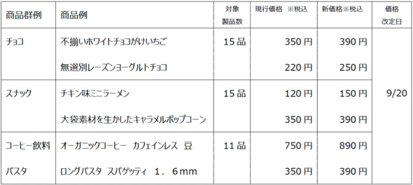 「不揃いホワイトチョコがけいちご」を350円から390円に、「チキン味ミニラーメン」を120円から150円に、「オーガニックコーヒー カフェインレス 豆」を750円から890円に、「ロングパスタ スパゲッティ 1.6mm」を350円から390円にそれぞれ値上げする。
