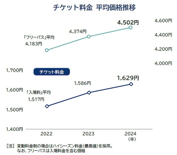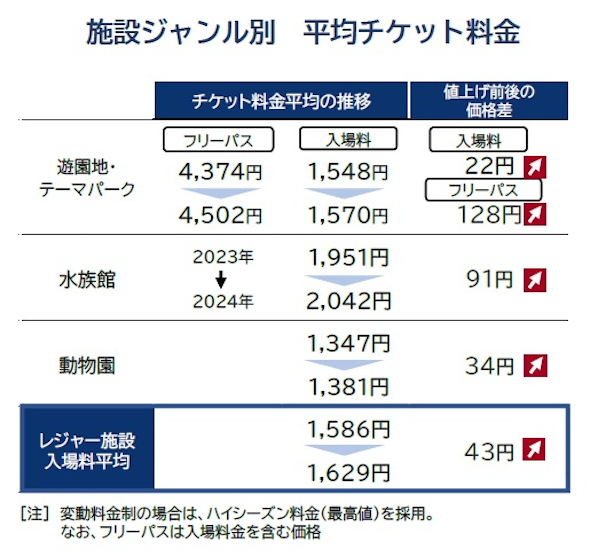 遊園地・テーマパークの多くが導入しているフリーパスの平均価格は4502円で、前年からの上昇幅は128円(2.9%)と、入場料の上昇率を上回った。帝国データバンクは「変動価格制の導入が進み、特に大型連休時の最高値引き上げが要因となった」と分析する。