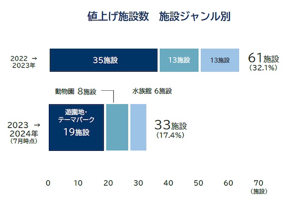 値上げした施設の数が前年から半減するなど、値上げの動きは鈍化しているものの、電気代や人件費などのコストアップを背景に、値上げへと踏み切らざるを得ない施設も多い。値上げ圧力は続くとみられ、同社は「2025年以降も、チケット料金改定に踏み切る施設が再び増加する可能性がある」と指摘する。