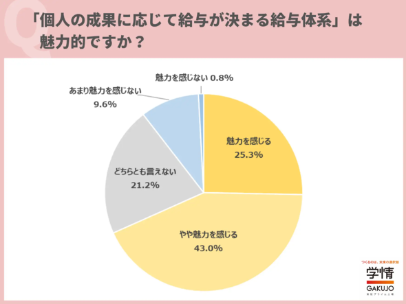 「個人の成果に応じて報酬が決まる給与体系」に、魅力を感じる学生は7割――就活情報サイトを運営する学情(東京都中央区)が、そんな調査結果を発表した。終身雇用が当たり前ではなくなりつつある中、2026年卒の学生は「給与体系」をどのように捉えているのだろうか。