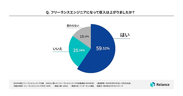 フリーランスエンジニアになって収入が上がった人は59.52%で過半数を占めた。「下がった」は25.34%、「変わらない」は15.14%で、7割超がフリーランス転身前と同額以上の収入を得ていることが分かった。