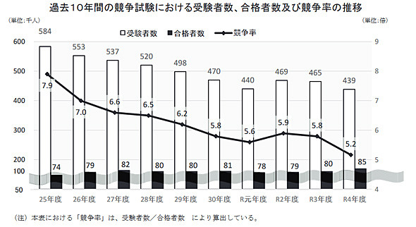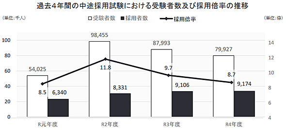 総務省のまとめによれば、地方公務員の採用試験(2022年度)の倍率は5.2倍となり、過去30年間で最低の数字となりました。受験者数の減少が続く背景としては、少子化や待遇などへの不満が挙げられていますが、同時に地方公務員の若手職員の退職率も上がっていることから、地方自治体における人材確保は喫緊の課題であることが分かります。