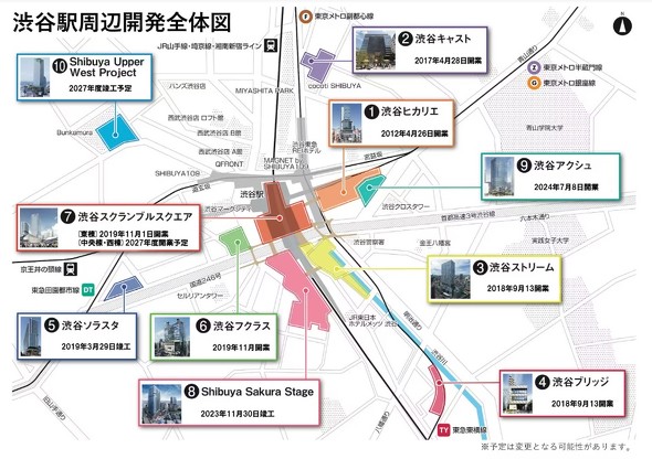 100年に一度のスケールで大改造が進む渋谷再開発が最終段階に入ってきた。7月に入ってJR渋谷駅東口エリアに複合施設「渋谷アクシュ」、南口エリアに「渋谷サクラステージ」が相次ぎ開業。渋谷駅前では「渋谷スクランブルスクエア」の西棟と中央棟が2027年度に完成予定となっている(2019年11月に東棟がオープン)。