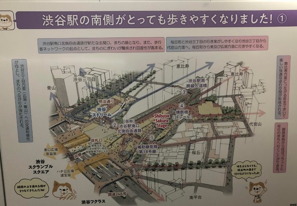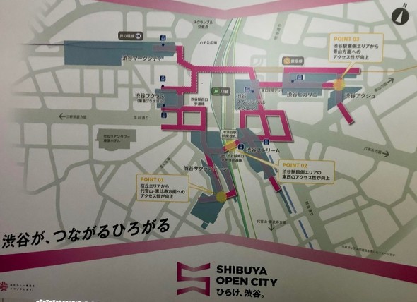 渋谷駅は渋谷川の谷底にある地形のため、道玄坂、宮益坂、恵比寿、代官山、各方面への相互回遊性が乏しかった。しかし、高低差解消を目指した動線をつくる再開発により、スムーズな行き来ができるようになってきた。