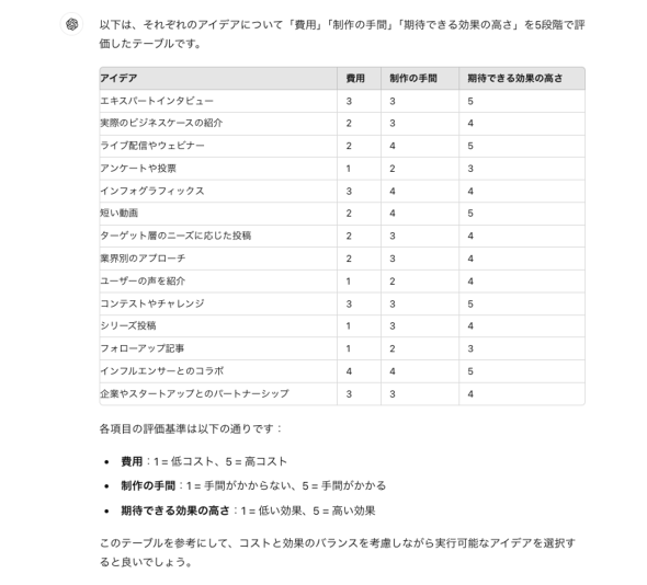 それぞれのアイデアについて「費用」「制作の手間」「期待できる効果の高さ」を5段階で評価してテーブルにまとめてください。