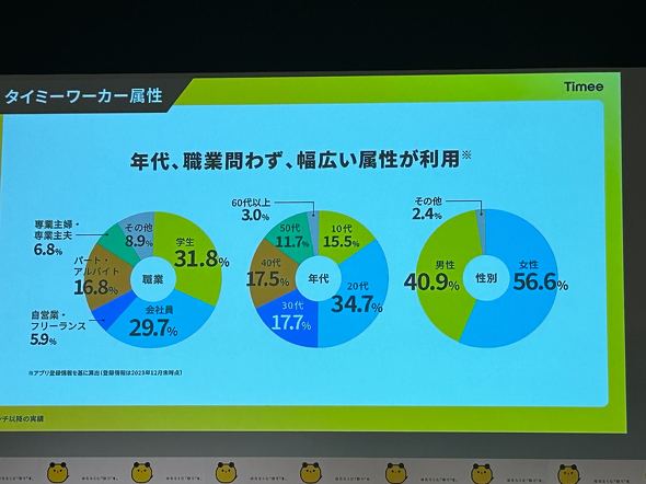 事業拡大の背景として小川社長が挙げたのは、「自由に働きたい」という世代を問わないニーズの高まりだ。登録者数の内訳(2023年12月末時点)を見ると、学生が31.8%を占めている一方で、会社員の割合も29.7%に達しており、副業解禁やリモート勤務の広がりによる、働き方の変化も追い風になっているとの認識を示した。最近ではシニア層の登録者も増加しているとして、「働くインフラを作ることにつながっている」と手応えを語る。