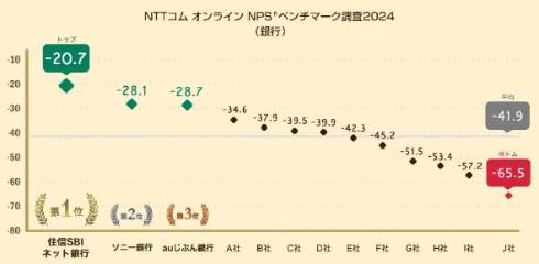 NPSのトップは「住信SBIネット銀行」(-20.7ポイント)となった。2位は「ソニー銀行」(-28.1ポイント)、3位は「auじぶん銀行」(-28.7ポイント)と続いた。