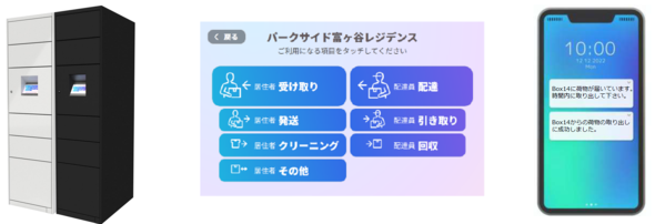このシステムは、マンションの住人であればスマホにアプリやLINEの公式アカウントに登録するだけで簡単に利用できるようにしている。配達業者がボックスに荷物を入れると住人に通知が届く。荷物の取り出しが完了した際にも通知が入る。ボックスに荷物が届いている時、帰宅時にマンションの玄関で認証をした際に、玄関の画面に通知が表示される。
