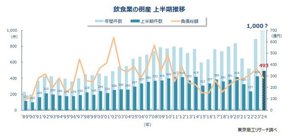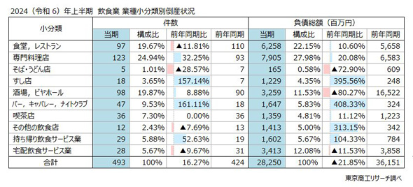 飲食業の倒産が増えている。東京商工リサーチが調査結果を発表し、2024年上半期における倒産数が前年同期比16.2%増の493件で、同期間として2年連続で過去最多を更新したことが分かった。日本産業分類の「飲食業」を対象に調査した。