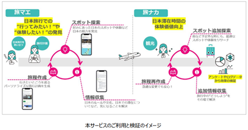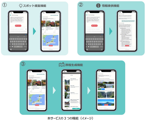 他に、特有のルールや文化など日本での旅行の疑問や不安に回答する「情報提供機能」、提案されたスポットの中から旅行プランを生成する「旅程生成機能」がある。