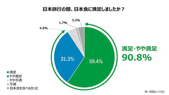 日本旅行で日本食に「満足した」と回答した人は59.4%だった。「やや満足」(31.3%)と合わせて、9割超が満足している結果となった。旅行中に日本食以外を食べたくなったと回答した人は38.5%で、「食べたくならなかった」(23.3%)を上回った。