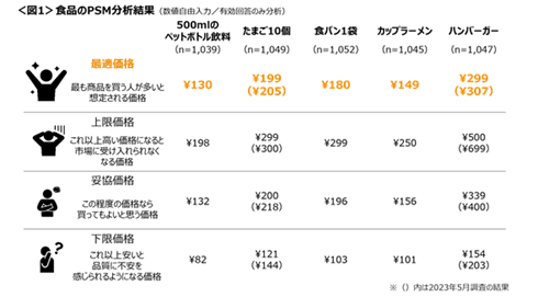 ペットボトル飲料やたまご、食パン、カップラーメン、ハンバーガーの適正価格についてPSM分析(価格に関する4つの質問から、モノやサービスの受容価格帯を明らかにする分析手法)を行った。