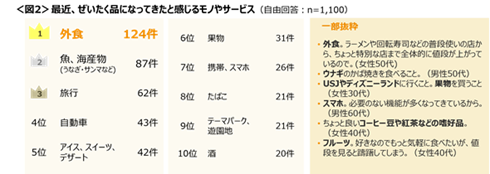 2022年以降、多くの食品で値上げラッシュが続いている。マーケティングリサーチ事業を行うクロス・マーケティング(東京都新宿区)は、全国の20〜69歳の男女を対象に「価格に関する調査(2024年)」を実施した。最近、ぜいたく品になってきたと感じるモノやサービスの1位は「外食」(124件)だった。