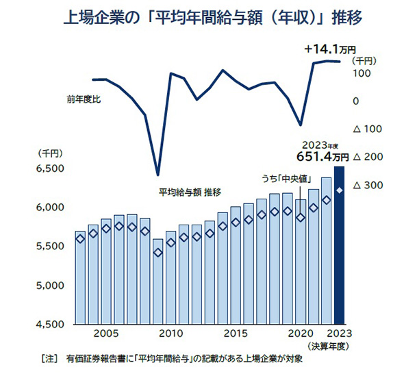 賃上げのニュースを目にすることが多い昨今、上場企業の平均年間給与はどの程度なのか。帝国データバンクが調査結果を発表し、上場企業の2023年度平均給与は651万4000円で、過去20年の最高値となったことが分かった。