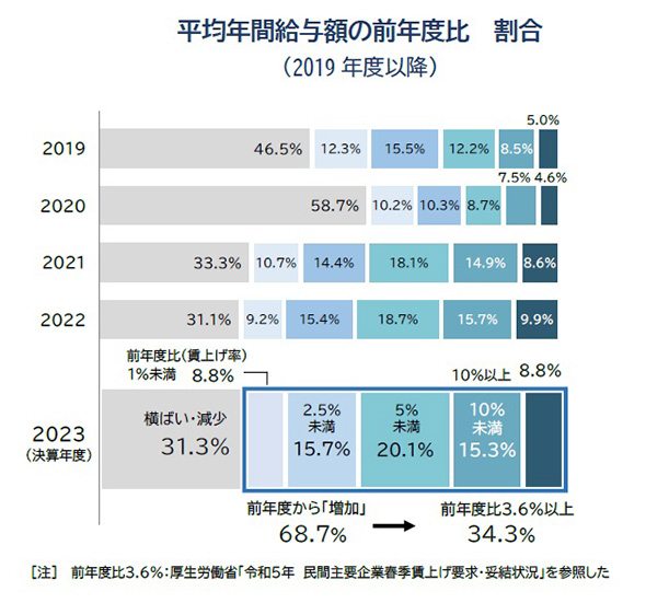 2022年度から2023年度にかけて、平均年間給与が増加した上場企業は68.7%と、2年連続で賃上げ企業が7割近くにのぼった。一方、増加率で最も回答が集まったのは「5%未満」(20.1%)だった。