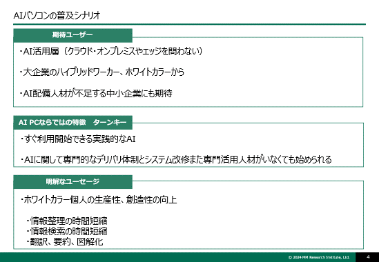 一方で、生成AIを活用する企業の特徴を見てみると、AI人材を外部から採用して利用を推進している実態もうかがえる。現時点でのAI活用は人材に依存する部分が大きく、AIパソコンが提供する「誰もがすぐ実践できる」ソリューションが求められていて、AIパソコンの普及ドライバーになると、MM総研は予測している。