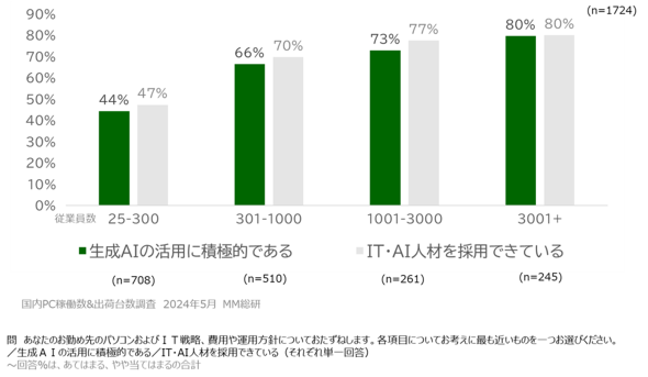 企業の情報システム部門へ、パソコン投資を増やすかを聞くと、パソコンへの投資を実際に増やす企業は、生成AIの活用にも積極的であることが分かった。労働人口の減少に向け、従業員個人の生産性を上げていくことが課題となる企業は、パソコン投資を増やすことに「積極的」「やや積極的」と回答する割合が多く見られた。