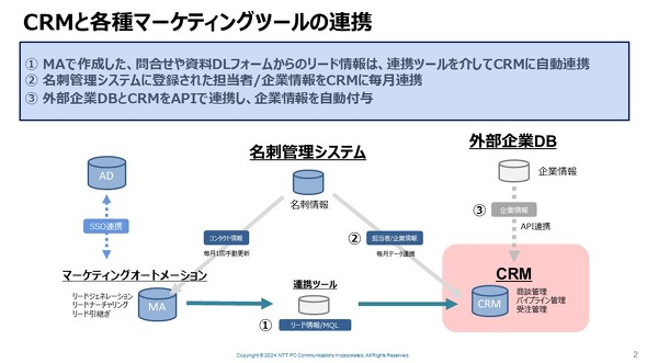 こうしたリード情報の共有が徹底できた背景には、CRMの活用にある。佐村氏は「基本的にはインサイドセールスと営業が見るシステムはCRMで統一している」とし、「CRMを中心に、MAツールや名刺管理ソフトなど複数のツールが連携されている」と話す。