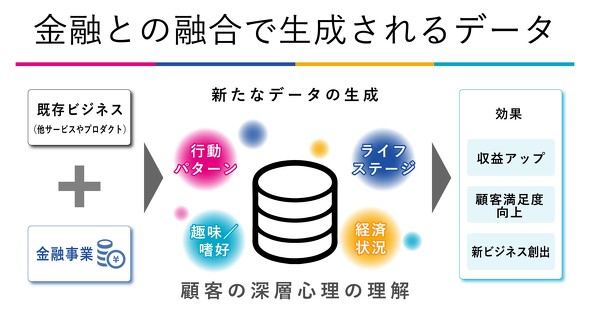 金融と既存ビジネスの融合で生成される重要なものとして「データ」があります。特に、現代のデジタルマーケティングにおいては、データの「鮮度」が非常に重要視されます。顧客との接点が増えるほど、企業が持つデータは新鮮さを保ち、より厳密な意思決定を下すことが可能となります。その結果、事業が飛躍的に成長するきっかけとなり得ます。
