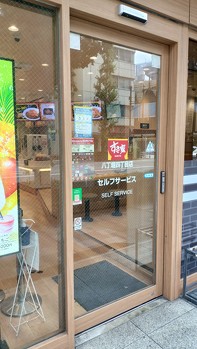 こうした店舗の自動ドアには「セルフサービス」と書いてあり、同タイプの店舗は松屋と同様に、入口付近の券売機で券を購入するシステムになっている。従来店のように店員が料理を運ぶのではなく、番号を呼ばれた客が取りに行く手順なのも特徴だ。食後は客が返却口に食器を返すため、基本的に店員がホールに出てくることはない。