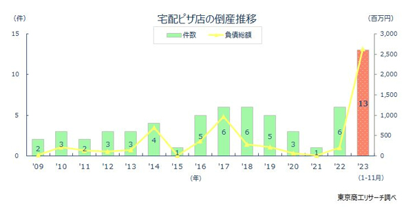 実際、バブルの反動も出ている。2023年12月に東京商工リサーチが発表したところによれば、同年1〜11月の「宅配ピザ店」の倒産は13件だった。これは集計を開始した2009年以降、最多だった年間6件を大きく超えて「過去最多」だったという。