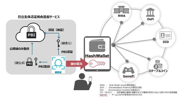 HashPortが提供するWeb3ウォレット基盤「Hash Wallet」に、日立の公開型生体認証基盤「PBI」を組み込むことによって、ユーザーは事前に設定した生体情報の認証(顔認証)により本人確認が可能になる。