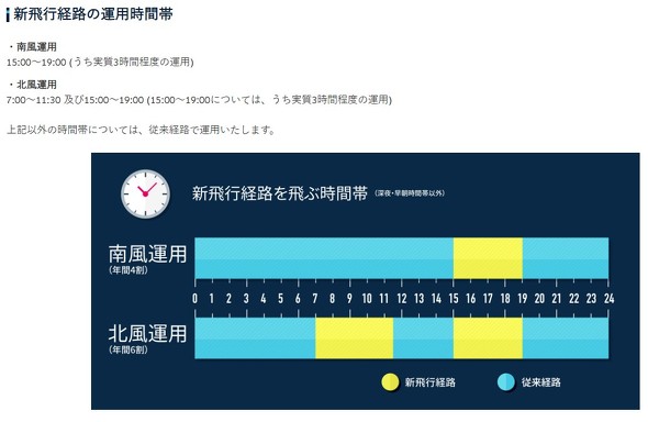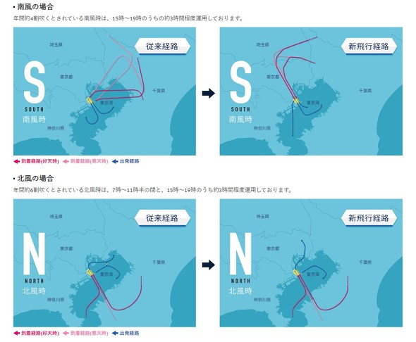 2020年3月29日から都心上空を通る飛行ルートの運用が始まり、年間約4万回の追加が可能となった。都心上空ルートは南風の日は15時から19時のうち約3時間、北風の日は7時から11時30分のうち3時間と15時から19時のうち約3時間となっている。飛行ルート直下の自治体に配慮して、国際線が増える時間帯が設定されている。