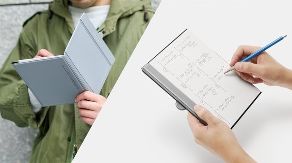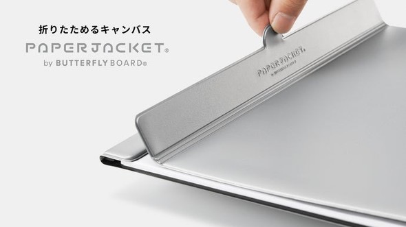 2022年に発売した「ペーパージャケット」は、ホワイトボードの「消すのが面倒」という意見から生まれた商品です。これは紙のページを特殊マグネットで挟んで固定しており、使い終わったページは紙を破ることなく外せるという商品です。