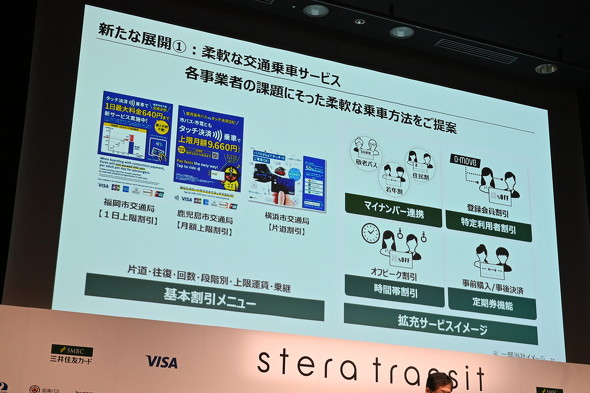 すでに福岡市や熊本市で導入されている一日乗り放題に加え、「月の上限サービスも開発した。すでに鹿児島市交通局に導入されており、定期よりも幅広いニーズに対応できる」(大西氏)という。特定のカードやサービス利用者向けの割引、オフピーク時の割引など、従来のICカードシステムでは難しかった多様な料金設定も可能になる。