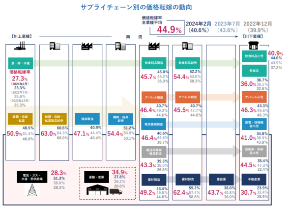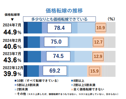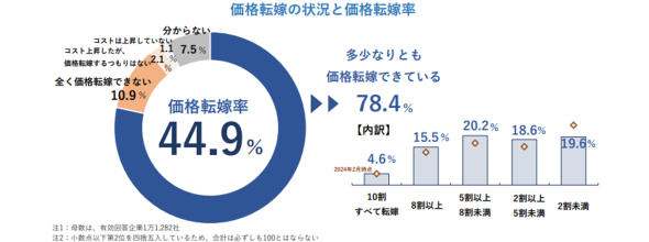 コスト上昇分に対する販売価格への転嫁度合いを示した「価格転嫁率」は44.9%。コストが100円上昇した場合に販売価格に反映しているのは44.9円で、残りの5割以上は企業が負担している計算となるが、2024年2月の前回調査(40.6円)と比較すると、4.3円分転嫁が進んだ。