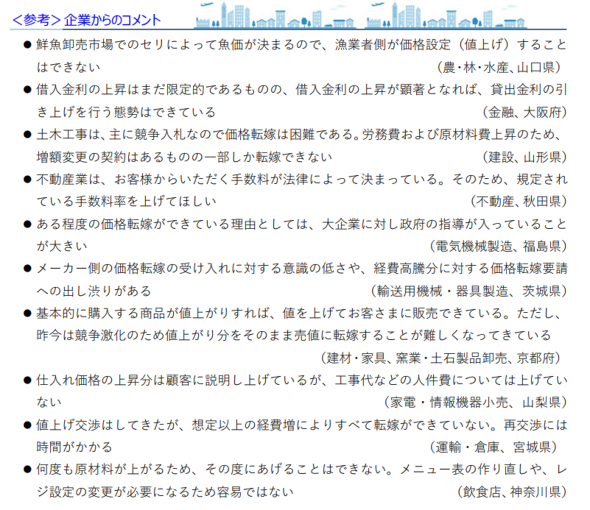 「全く価格転嫁できない」とした企業は10.9%で、前回調査(2024年2月)から1.8ポイント減少したものの1割を占めた。「厳しい競争があり、コストを転嫁すれば顧客を失ってしまう」(機械・器具卸売、愛媛県)などの声も上がった。