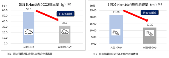 ダブル連結トラックは、同じ重量を輸送する場合において通常の大型車両に比べてCO2排出量は約40%、燃料消費量も約40%削減の効果があるという。