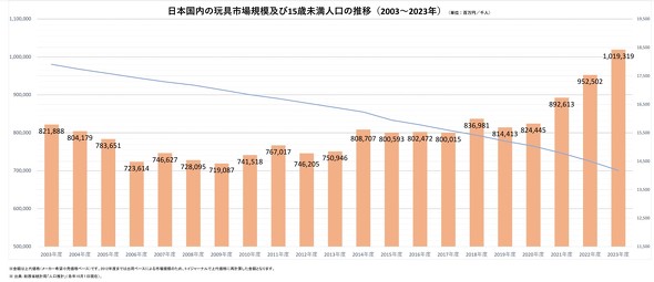 日本国内の玩具市場規模は2019年度から右肩上がりで伸長している一方、同市場における15歳未満人口は2003年から減少し続けている。少子化が進む中でも玩具の「大人買い」が市場をけん引しているようだ。