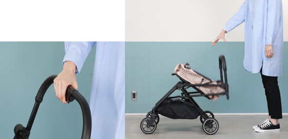 車体には、既存商品で「開閉が簡単だ」と高評価を得ている技術を応用し、1秒かつ片手開閉ができる構造を採用。ハンドル部のボタンを押すだけで自動で畳むことができ、同じボタンを押しながらハンドルを引き上げるだけで、かがまずに開けるようにした。