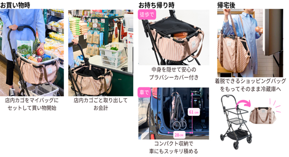 2020年7月のレジ袋有料化でマイバッグの持参が習慣化する中、同社は荷物入れに車輪が付いたショッピングカートに着目。荷物を持ち上げる頻度を減らし、押す力で軽々と運べて便利なことに加え、ショッピングカートとベビーカーの構造に類似点があることから、これまでに培ってきた独自のノウハウを生かせると考えた。