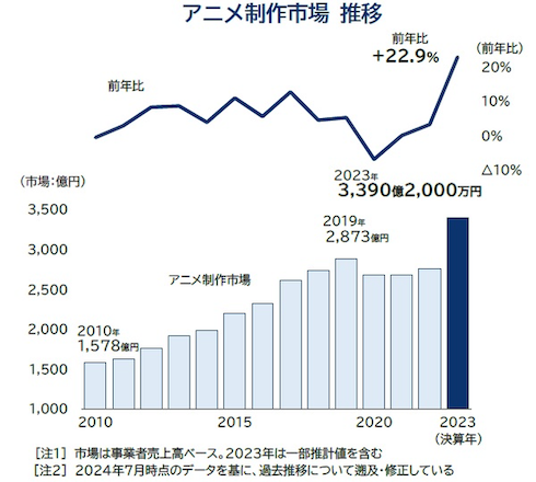 アニメ制作の市場規模が、初めて3000億円を突破した。帝国データバンクが調査結果を発表し、2023年は事業者売上高ベースの市場規模が、前年の2757億8300万円を22.9%上回り、過去最高となる3390億2000万円だと分かった。現状の業績ペースで推移した場合、2024年は3400億円前後での着地が予想される。