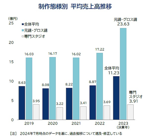 2023年の国内アニメ制作会社1社当たり平均売上高は、11億2300万円だった。2022年以降、2年連続の増加でこちらも過去最高。「増収」が37.2%、「減収」が24.9%と、増収が減収を上回った。一方で「増益」となった企業が44.9%、「赤字」は32.3%で4年連続で3割を超え、二極化が進んでいる。