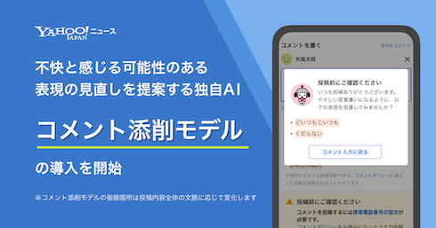 LINEヤフーは9月9日、運営する「Yahoo!ニュース」のコメント欄において、AIを活用した「コメント添削モデル」の導入を開始した。ユーザーがコメントを投稿する前に、不適切な表現や不快感を与える可能性のある表現を指摘し、見直しを促す機能でコメント欄のさらなる健全化を目指す。