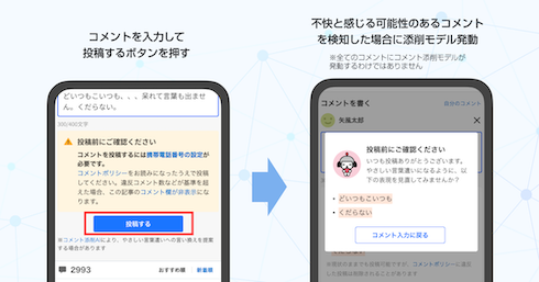 本機能は、コメントポリシーに違反する内容や、違反には該当しないものの閲覧者が不快に感じる可能性のある表現を対象としている。ユーザーが「投稿する」ボタンを押した際、AIが問題のある表現を判断し、該当箇所をハイライトで示すとともに、表現の見直しを提案するポップアップを表示する。投稿完了前に表現の見直しを行うことが可能となる。