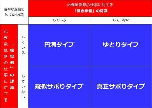 認識のズレが生じるメカニズムを確認するために、必要最低限の仕事をしているか否かの職場側の認識を縦軸、働き手側の認識を横軸にとって整理してみると、静かな退職をめぐる状態は大きく以下の4タイプに分類されます。