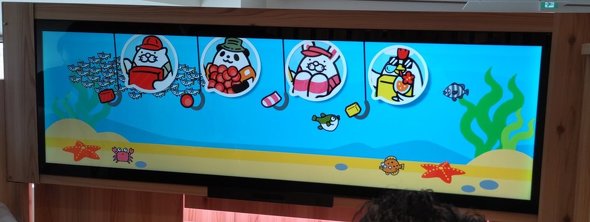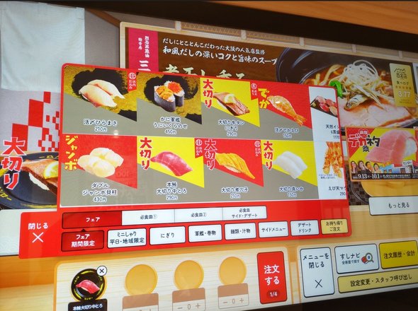 デジローは店内のボックス席に設置しているもので、150(幅)×50(高さ)センチの大型ディスプレイ上に寿司の回転レーンが登場する。利用客が気になった寿司をタッチすると注文できる仕組みだ(別のメニューからも商品は選べる)。2023年に発生した迷惑動画事件の影響を受け、国内の店舗では回転レーンに寿司を流さなくなった。そこで、店内のエンタメ性を高めるためにデジローが開発された側面もある。