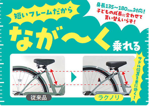 ラクノリを開発したきっかけは、身長が低い人が乗れる26インチの自転車をつくれないかと考えたからだ。135〜140センチほどの身長だと24インチを選ばざるを得ないが、フレームサイズを短くすることで、26インチの自転車にも乗れるようにした。