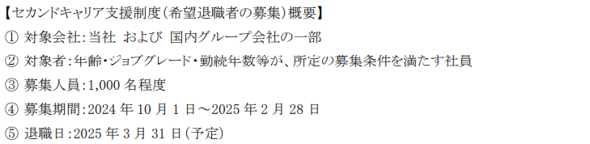 対象となるのは年齢・ジョブグレード・勤続年数などが、所定の募集条件を満たす社員。募集期間は2024年10月1日〜25年2月28日で、退職予定日は25年3月31日とした。