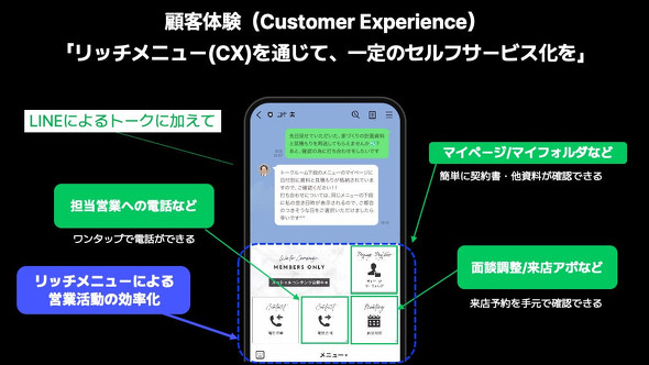 この問題に対処するためLINE WORKSでは、顧客のLINE画面上で、営業担当者に電話できるボタンを追加したり、ボタン一つで面談調整や来店アポが取れたり、契約書などの資料をワンタッチで確認できるボタンを付与する形を提案している。このリッチメニューを追加することで、顧客体験を向上させるだけでなく、一定のセルフサービス化を実現。営業の業務効率化にもつなげられる。