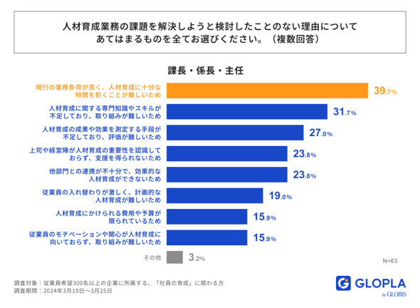 検討したことがない理由について「課長・係長・主任」層の中で特に多かった回答は「現行の業務負荷が高く、人材育成に十分な時間を割くことが難しいため」で、全体よりも5.4ポイント高い結果となった。